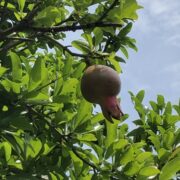 握りこぶしぐらいの大きな実がなります。 熟すと割れて種がたくさん出てきます。