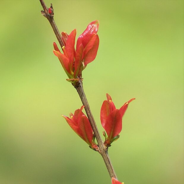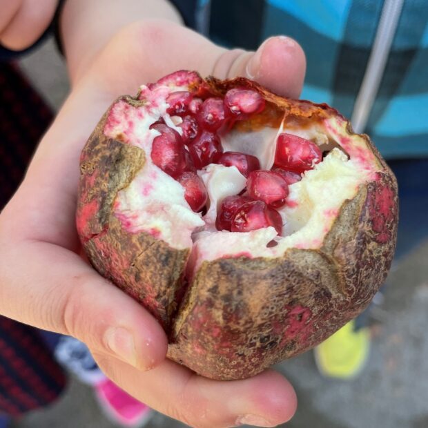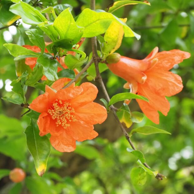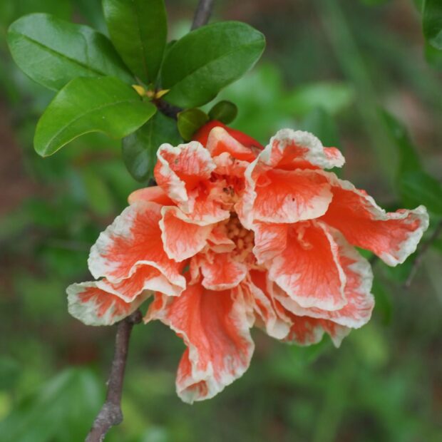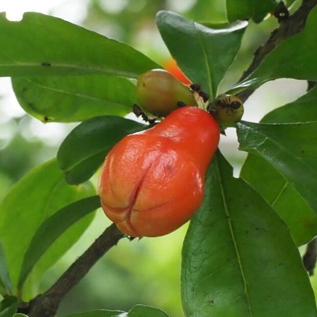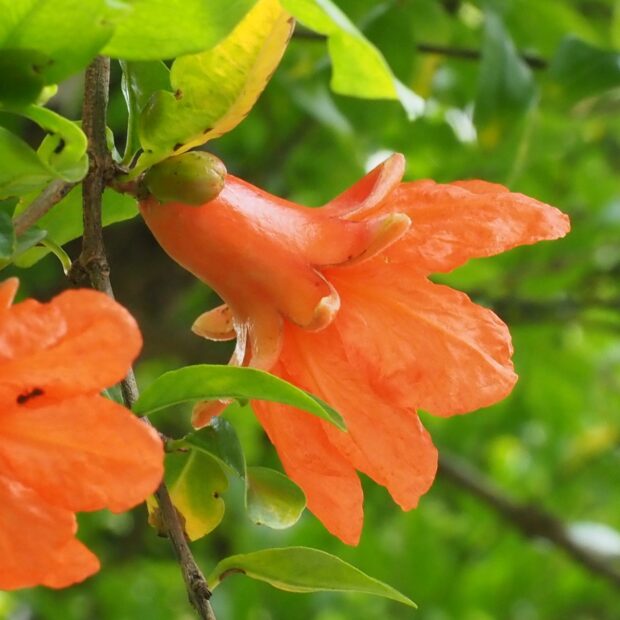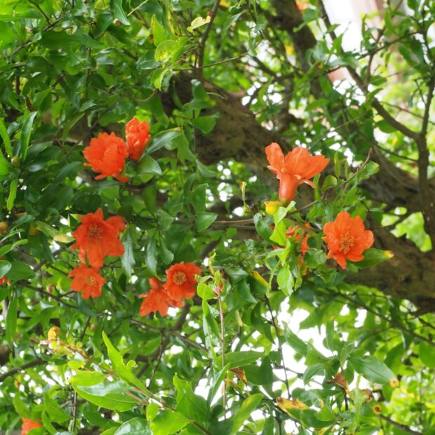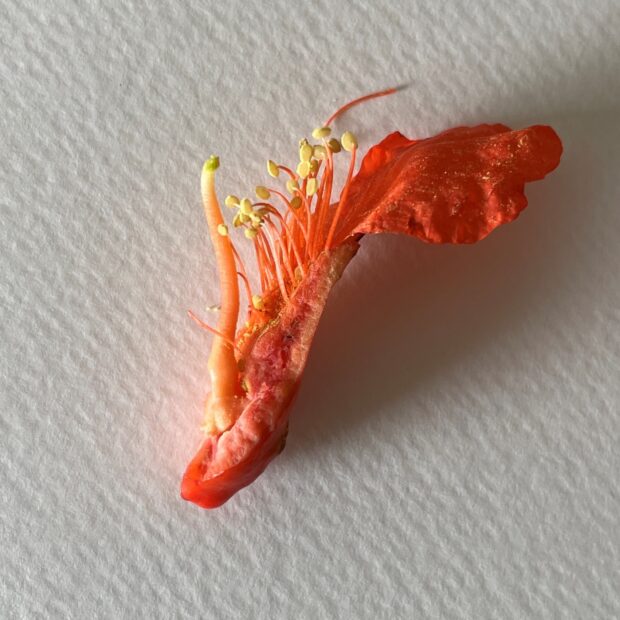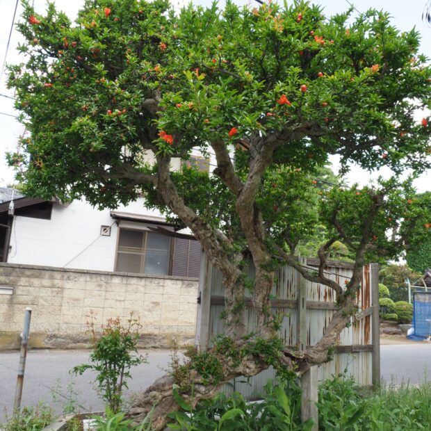 赤い花は、 後ろに鎧(よろい)のように硬くて厚い萼がついています。 厚い皮の実は、 割ると美しい赤色のツブツブが沢山入っています。