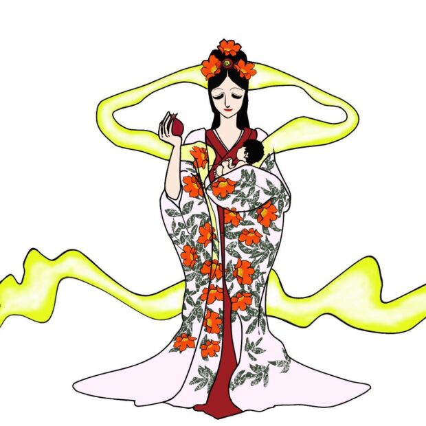 子授け、 安産、 育児の神として信仰されてきた鬼子母神は、 左手に赤子を抱き、 右手にはザクロの実を持っています。