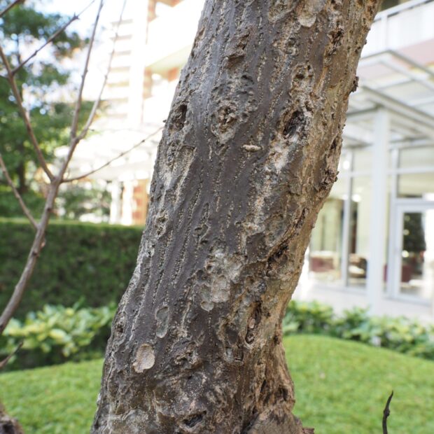 不規則に皮がめくれます。 年を経ると幹がねじれていきます。