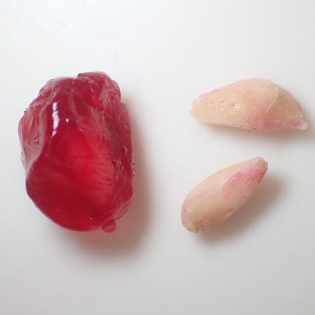 ゼリー状の皮に包まれた種は、 まるごと食べると健康や美容に効果があると言われています。 またゼリー状の皮から採れるグレナディンという赤色成分は、 香料や着色料として広く使われています。