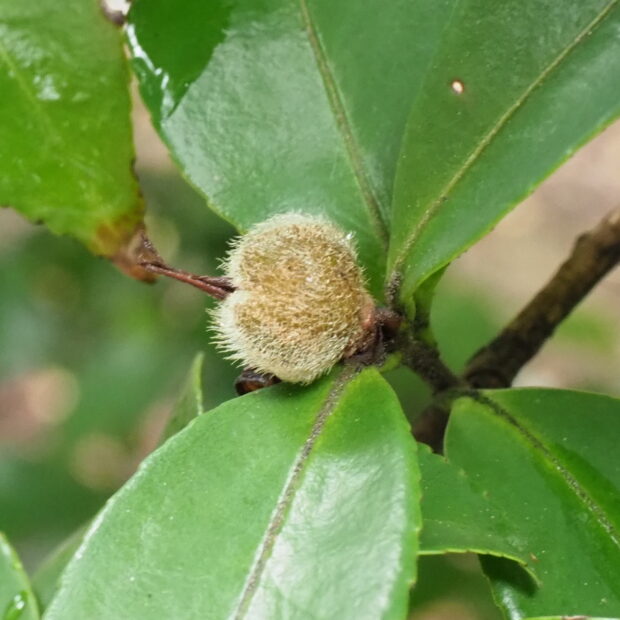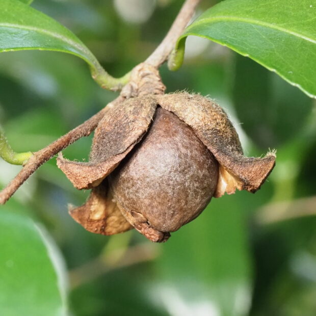 開花した翌年の9月頃に直径1.5~2㎝の球形でうっすら毛が生えた褐色の実が成ります。 10月頃に成熟し三つに割れて黒褐色の種子をのぞかせるようになります。 種子からは油がとれます。
