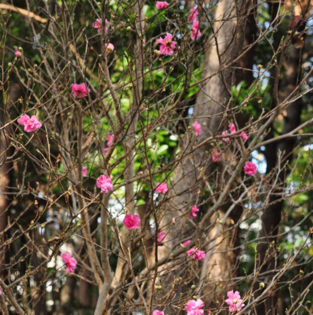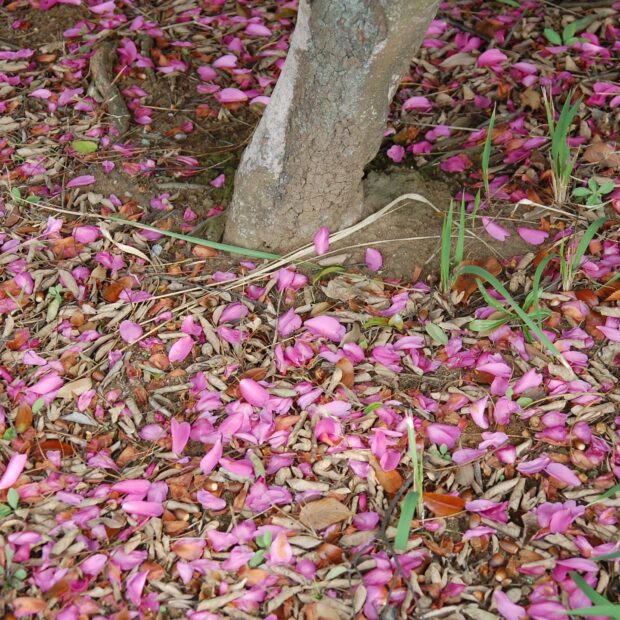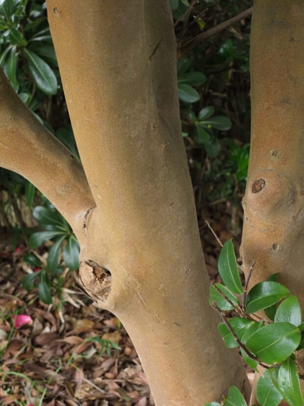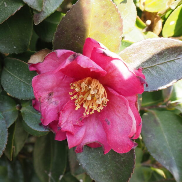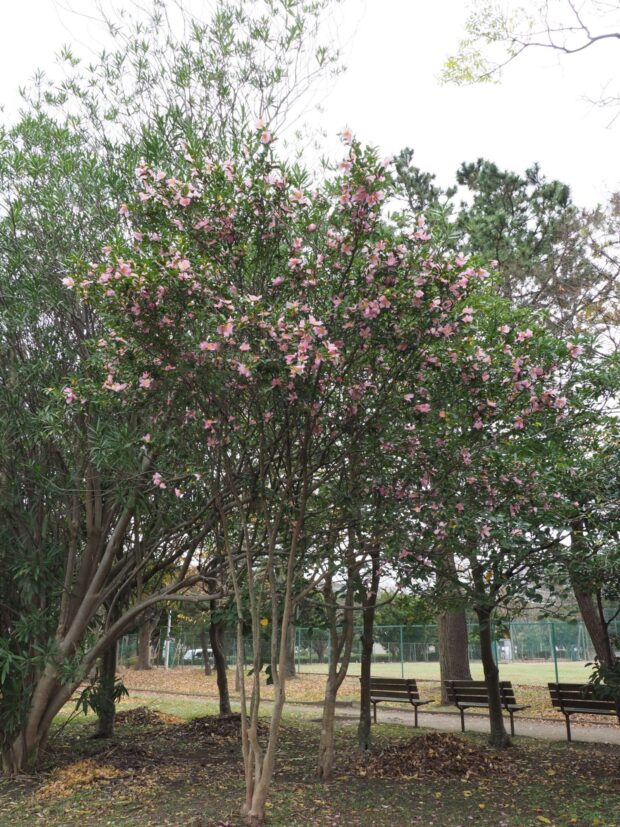 秋の終わりから冬にかけて大きな花が木いっぱいに咲きます。 花は花びらと雄しべが別々に散るのが特徴です。 品種改良され色とりどりの花が楽しめます。