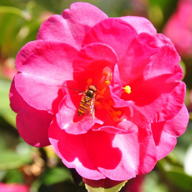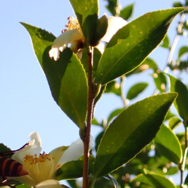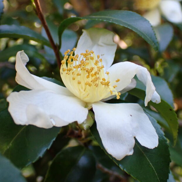 原種のサザンカは、 花弁が5〜7枚で白色、 香りで虫を呼びます。