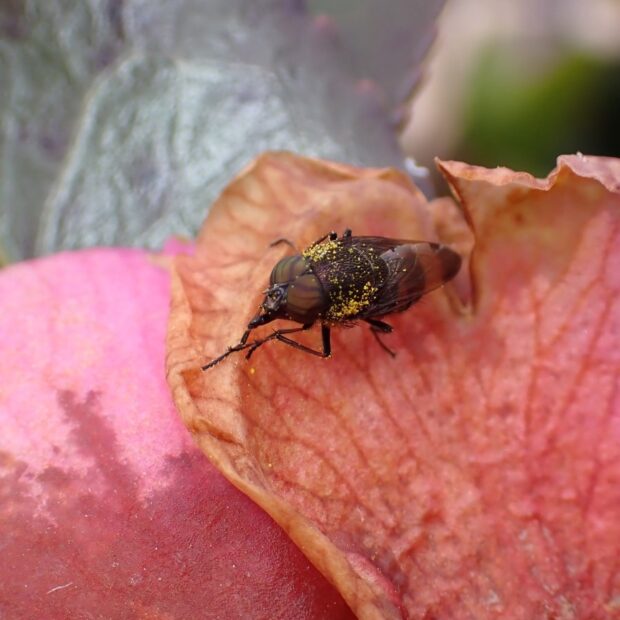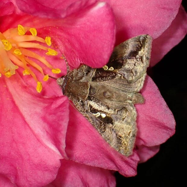 花にはメジロやヒヨドリなどが蜜を吸いにやって来ます。 鳥だけではなくハナアブなど小さな昆虫の姿もちらほら。 夜はガが登場し蜜を吸っています。