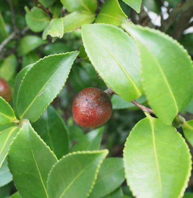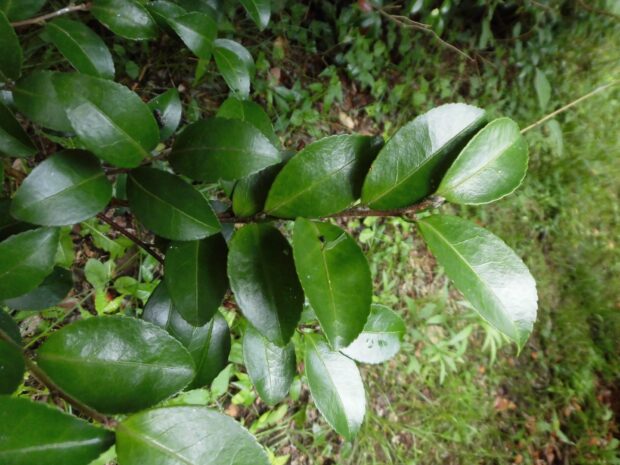 サザンカの葉は丈夫で長持ち。 同じ葉が数年間、 木についています。