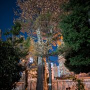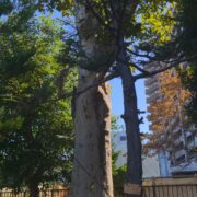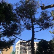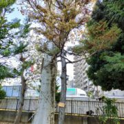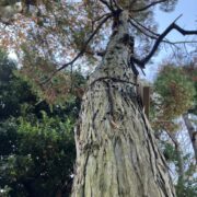 赤茶色の樹皮で薄く短冊状に裂けます。