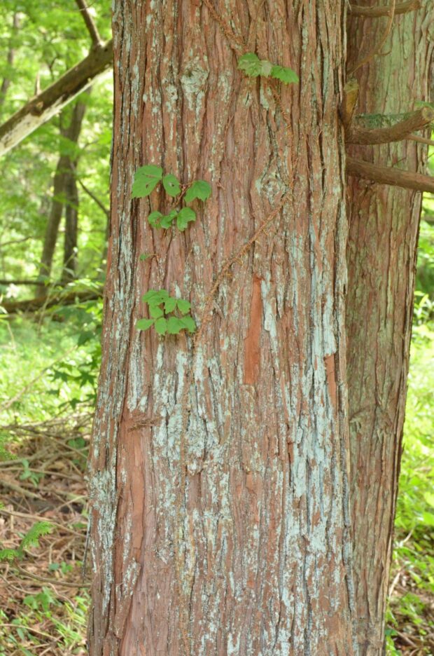 赤茶色の樹皮で薄く短冊状に裂けます。