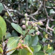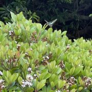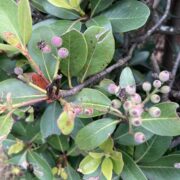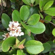 初夏に咲く花が『ウメ』に似ており、 葉が花を中心にして輪状につくので車輪梅(シャリンバイ)といわれます。 秋にはブドウに似た黒紫色の実がなります。