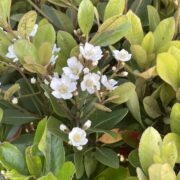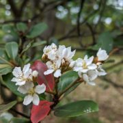 初夏に1~1.5㎝程の梅に似た白い花が枝先に集まって咲きます。 花は時間がたつと中心が赤くなります。