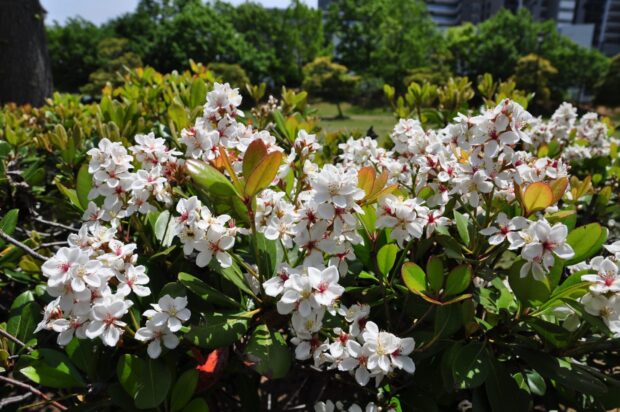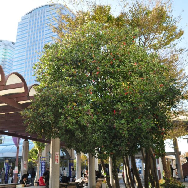街路樹として植えられたものは低木として低く丸く刈りこまれていることが多いです。 自然だと高さ1~4m程になりなります。