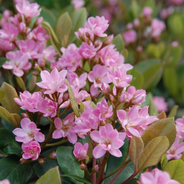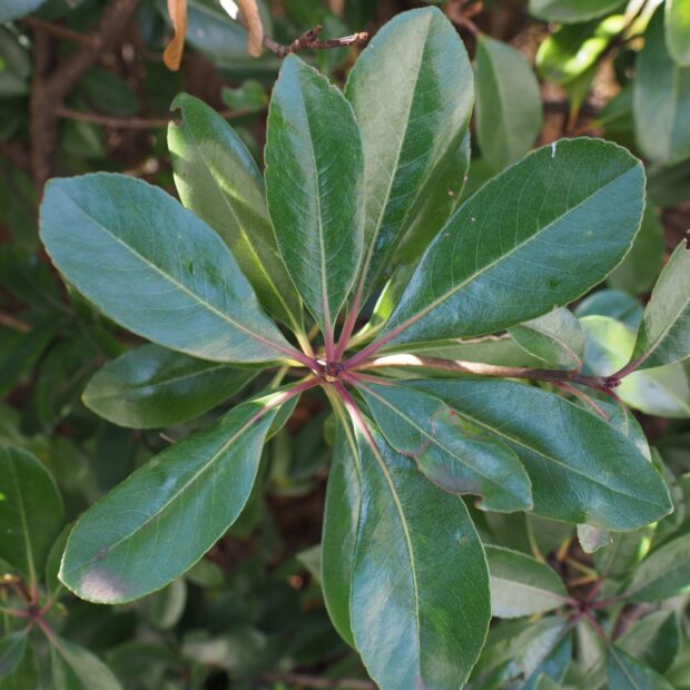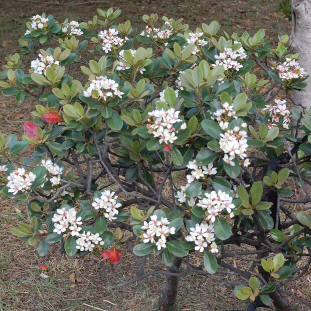 花が「ウメ」に似ており、 葉が車輪のスポークのように輪状につくことから「シャリンバイ」と名付けられました。