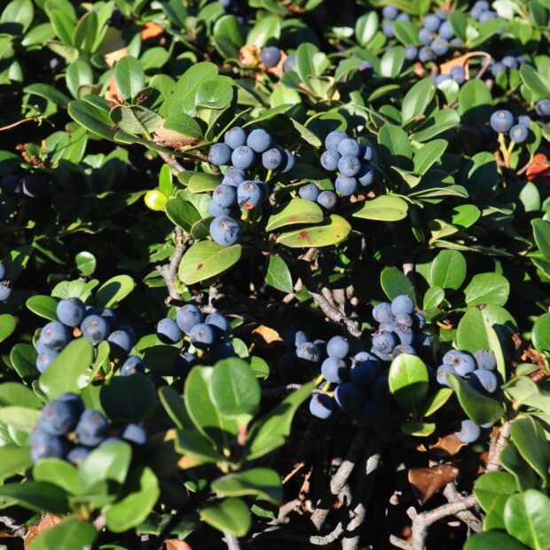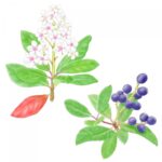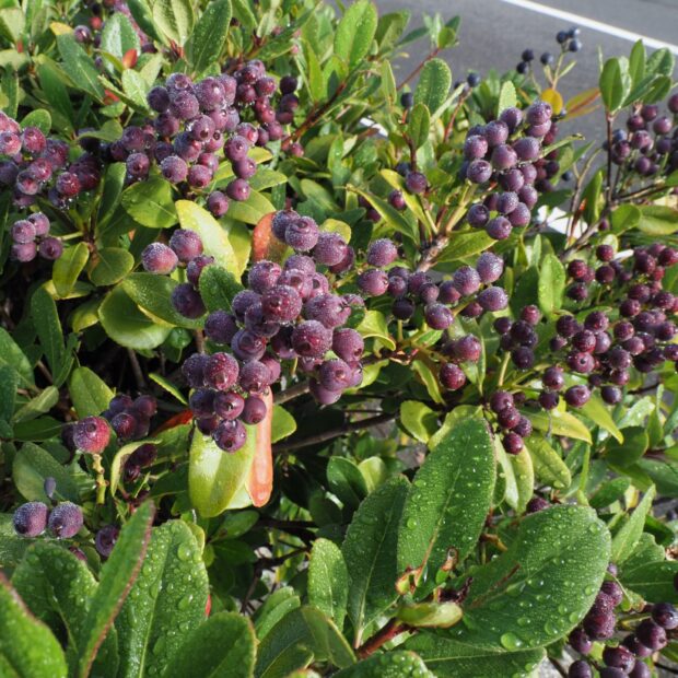 初夏に咲く花が『ウメ』に似ており、 葉が花を中心にして輪状につくので車輪梅(シャリンバイ)といわれます。 秋にはブドウに似た黒紫色の実がなります。