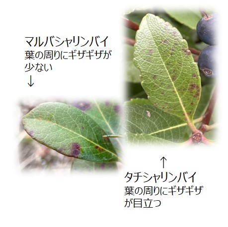 葉の縁に浅いギザギザ(鋸歯・のこぎりば)がまばらにあるものをタチシャリンバイ、 葉の縁にギザギザがほとんどないものをマルバシャリンバイと区別することもありますが、 中間型もあります。