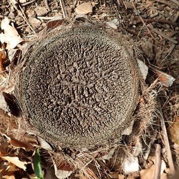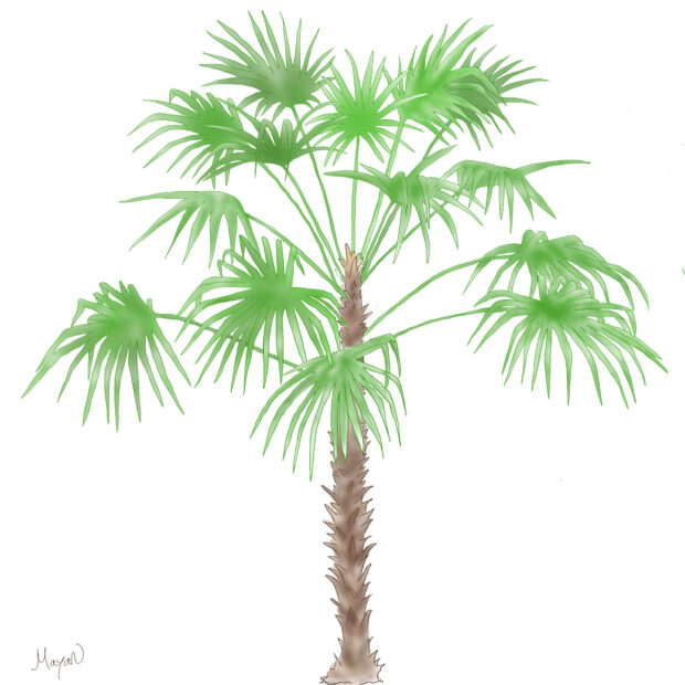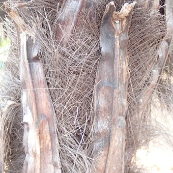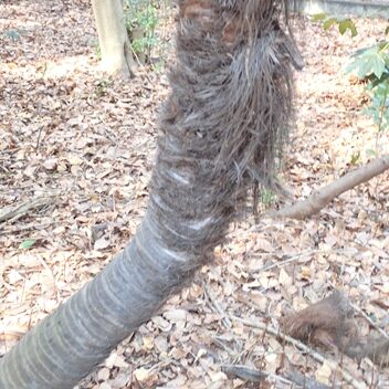 ふつうの木とは生長の仕方が違い、 年輪はなく太りません。 毎年背が高くなるだけで、 幹の太さは変わりません。 葉を守る苞がけばだち、 幹を繊維で包んでいます。 その繊維をより合わせてシュロ縄やホウキを作ります。