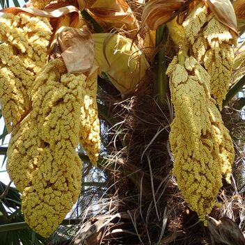 雄花は、 黄色い大きな房(ふさ)で、 まるでカズノコ。 雌花は、 柄がサンゴのように伸びて緑の花が咲きます。 雄の木と雌の木別々ですが、 両方咲いているものもたまにあります。