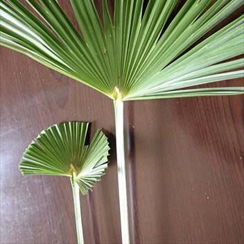 50~80cmの大きなうちわのような葉。 葉先が折れ曲がります。 トウジュロは葉先がぴんとしていて葉の開きが160度ぐらいのものが多く、 シュロは葉の開きが200度以上あります。