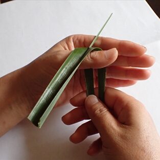 • 割いた葉を勢いよく下へ引くと葉脈が飛ぶ
