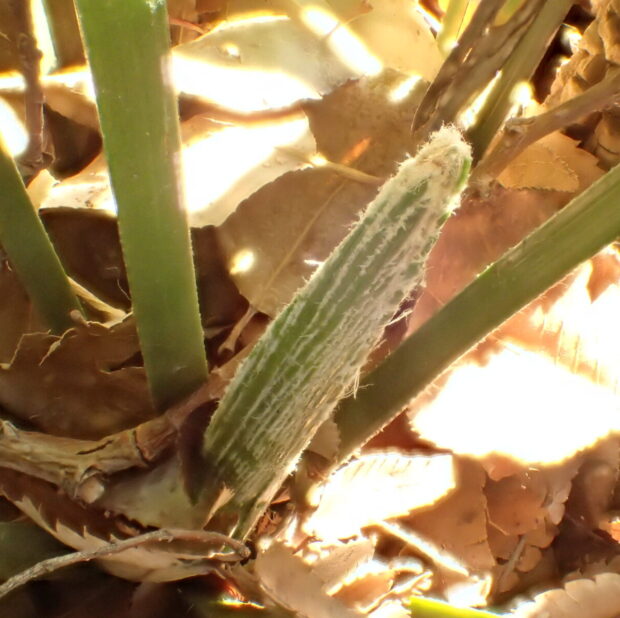 きっちりとたたまれた扇子のような芽が伸びてきて、 うちわのような1つの葉になります。 粗い毛に包まれています。