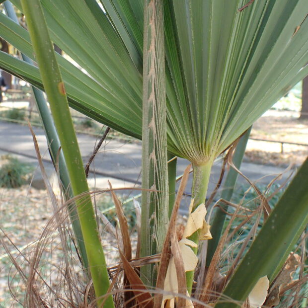 ヤシの木の仲間なので、 樹形は南国の木のよう。 大きな葉っぱを広げて太陽をあびようと上を目指します。 生長点が幹のてっぺんなので、 幹を切ると生長できず枯れてしまいます。