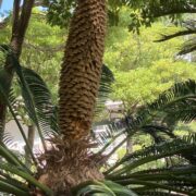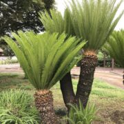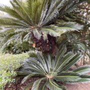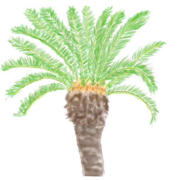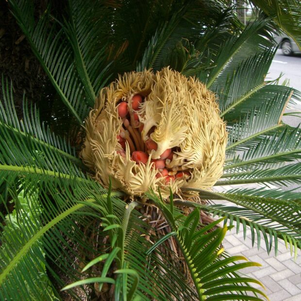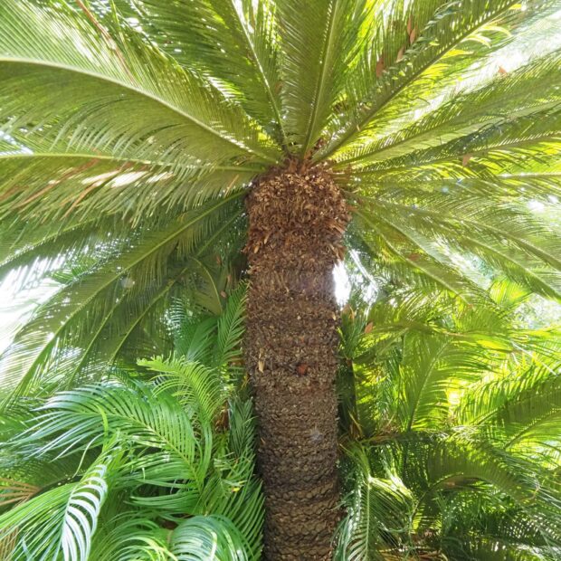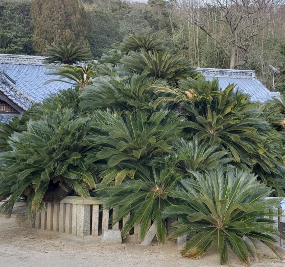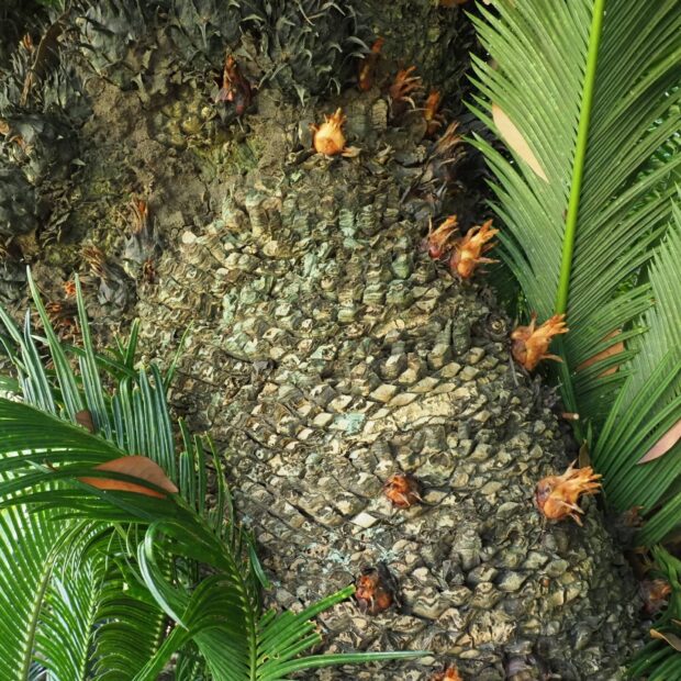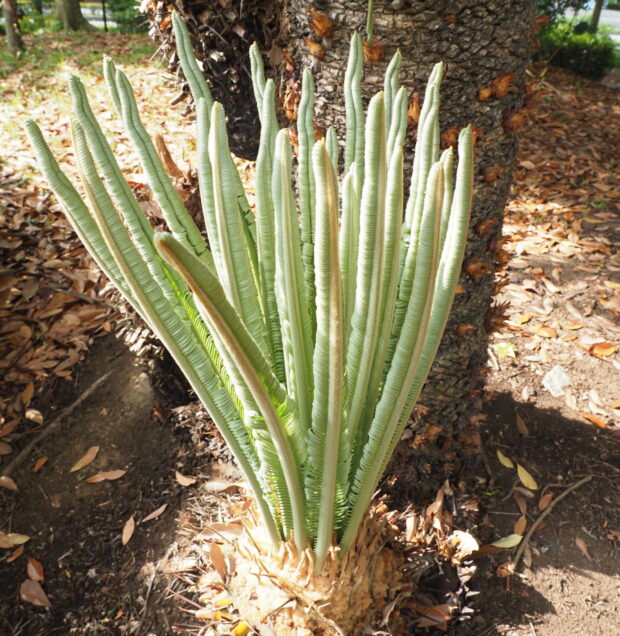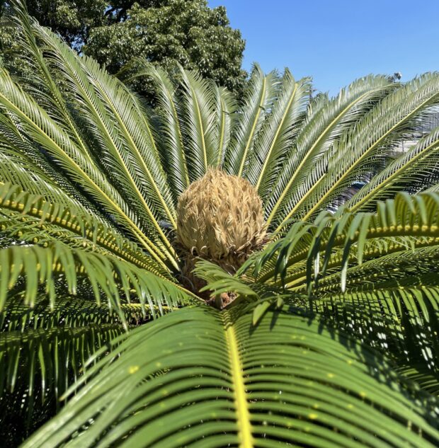 弱った時に根元に釘などを埋め込むと蘇ることから「鉄で蘇る(よみがえる)」→「蘇鉄(そてつ)」と呼ばれるようになったといわれています。