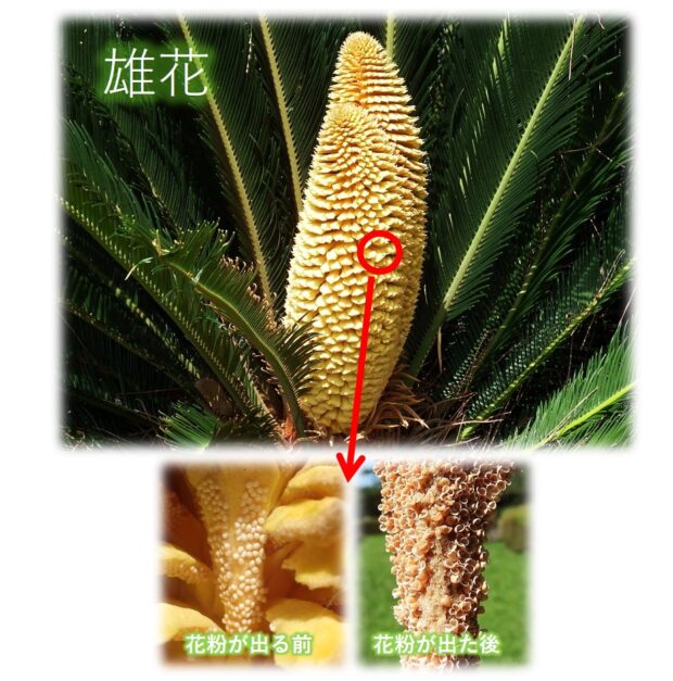 雄花には甘い香りがあります。 ソテツはこの香りで虫を呼び受粉を手伝ってもらっているという説もあります。