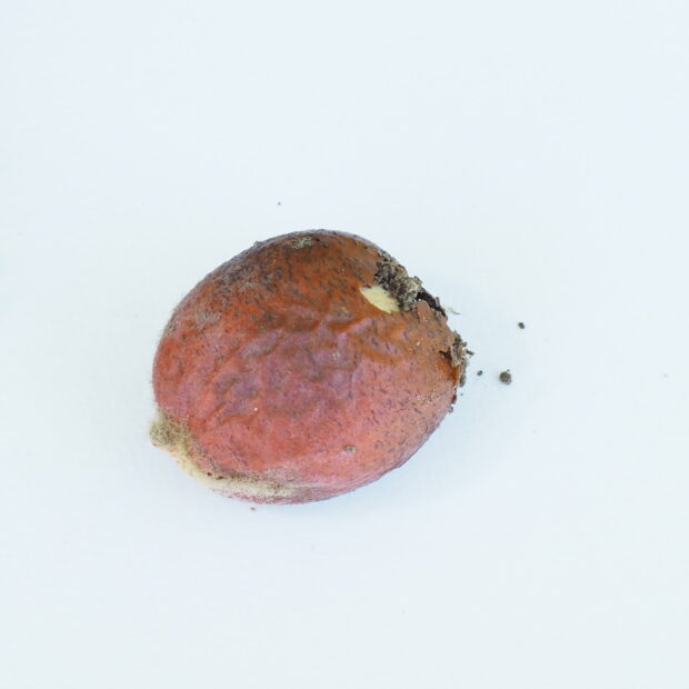幹の上に赤い皮につつまれた大きな種(長さ約4cm)が実ります。