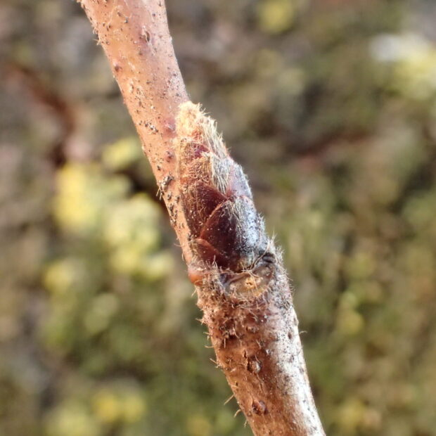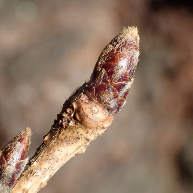 赤茶色の冬芽で、 毛が多めなのが特徴です。 葉痕の維管束痕は3つで、 お顔に見えます。
