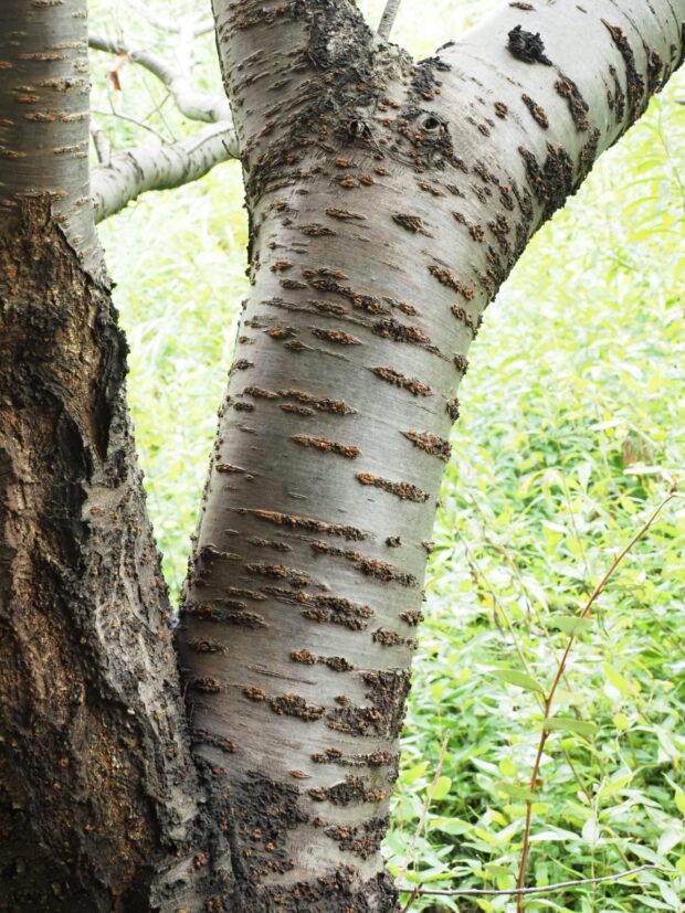 艶があり横向きの皮目(ひもく=皮の裂けているところ、 空気の通路となる)が目立ちます。 老木になると縦の割れ目も目立つようになり全体的に黒っぽくなります。