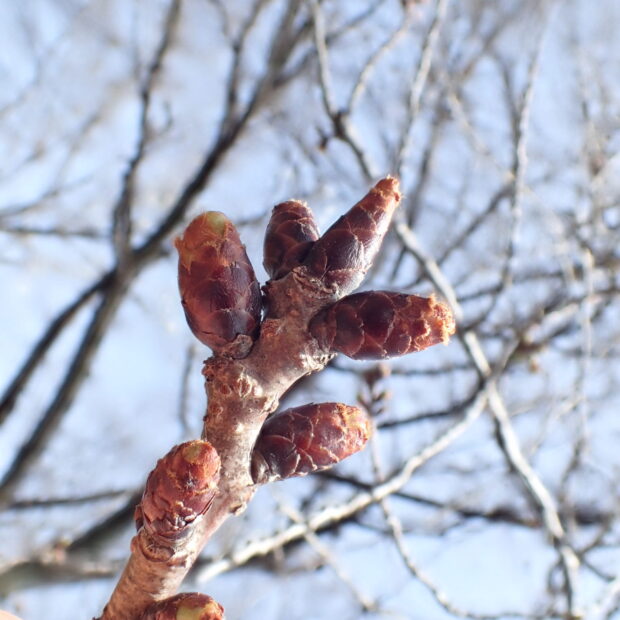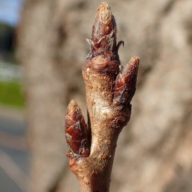 • 花芽がふくらんでくると、 枝先の葉芽がスリムなのがよくわかる