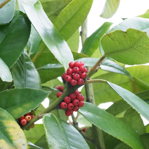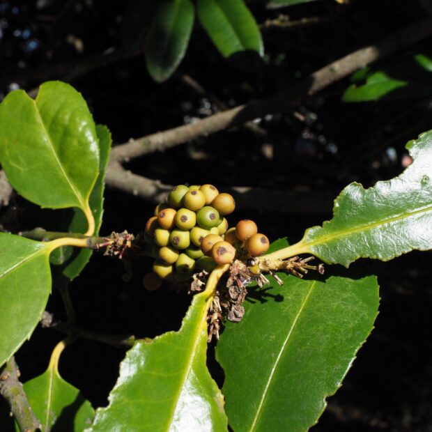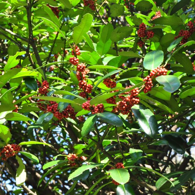 モチノキに似た直径8㎜程の球形の実がまとまってなります。 11月頃に赤く熟しきれいな樹形も相まって目立ちます。 中には三角楕円状の不規則の浅いしわが多数ある種子が4個入っています。