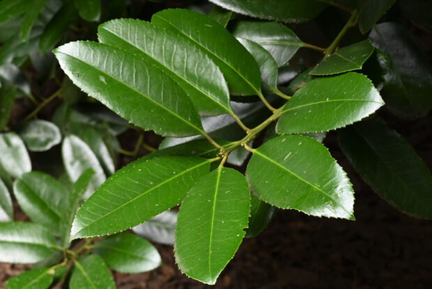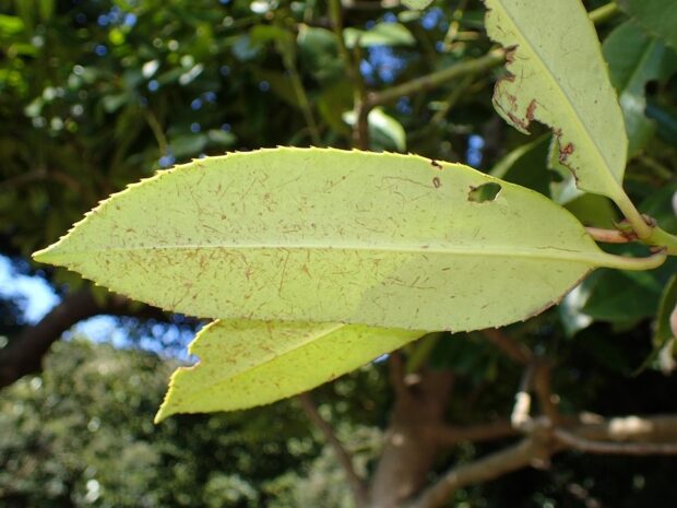 葉の長さは10~17㎝で大型です。 先は短く尖り、 縁には鋭いギザギザ(鋸歯・のこぎりば)があります。 両面ともに毛は無く表面は濃緑色で皮質で光沢がありツヤツヤとしており側脈がみえます。 裏面は黄緑色で側面は不明瞭で、 葉を傷つけると黒く変色します。