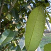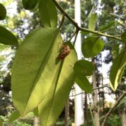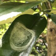 鉄筆などで引っ搔くとそこが黒い線となり乾燥した後も読むことができ、 戦国時代にはこの性質を利用して情報のやり取りをしたことから「葉書き(はがき)の木」とも呼ばれます。 この木を見つけた際は是非文字が書けるか試めしてみてください。