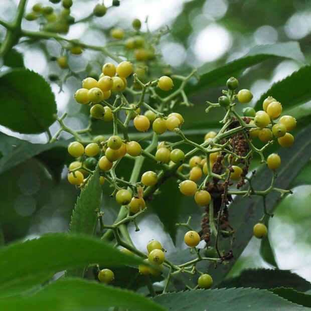 ニワトコの名前は、 ミヤツコギ→ミヤツコから転じたと言われています。 この名は「宮仕う木」に由来し、 大昔使われた木幣(神にささげた御札のようなもの)の材料にニワトコが用いられたことからきていると言われています。