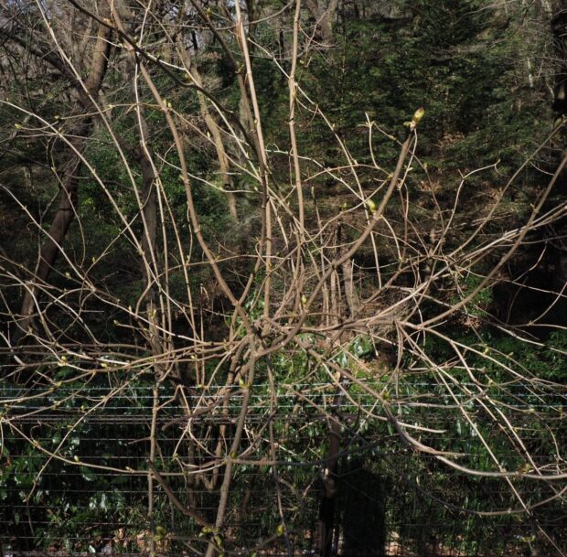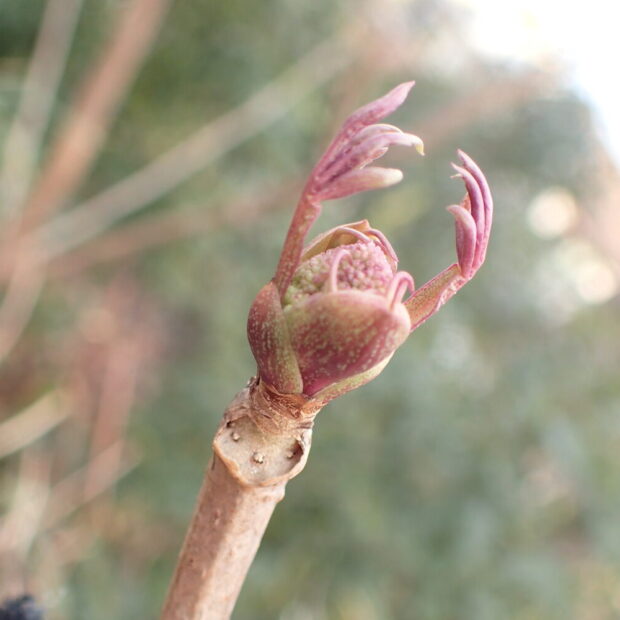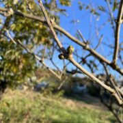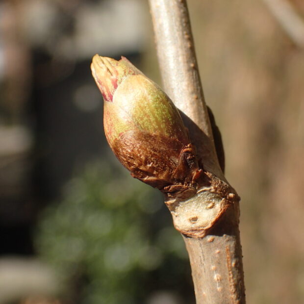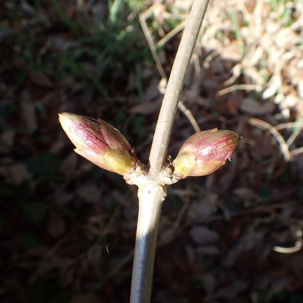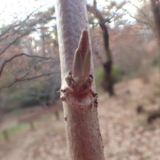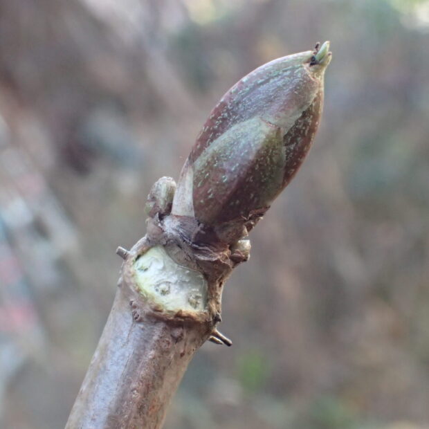 赤みのある大きな冬芽は、 太い枝に対生についていて目立ちます。 大きな葉痕は、 お顔に見えます。 維管束痕は3個のものが多いですが、 5個のものもあります。