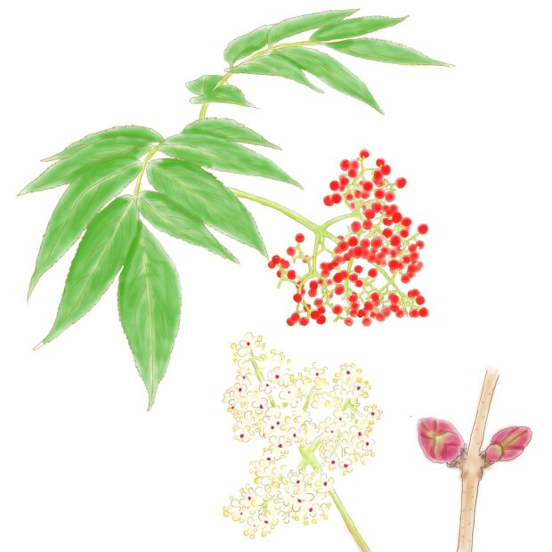 別名「接骨木(せっこつぼく)」は、 ニワトコの樹皮が骨折を治療するための湿布材に使われたことからきています。