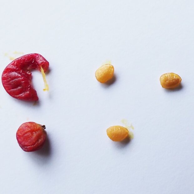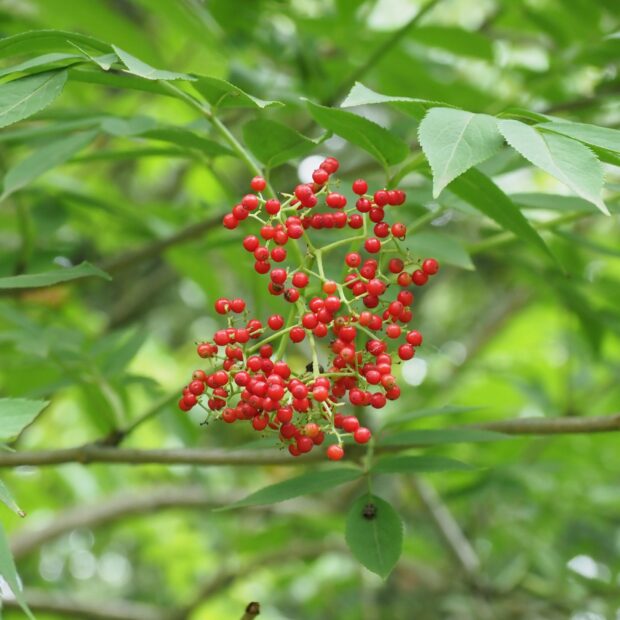 小さくて真っ赤な実がかたまって実ります。 真っ赤な実の色が、 新緑に映えてきれいです。 この実は鳥の大好物ですが、 人は食べると青臭く美味しく感じられません。 ですが縄文人は果実酒に使っていたことが分かっています。