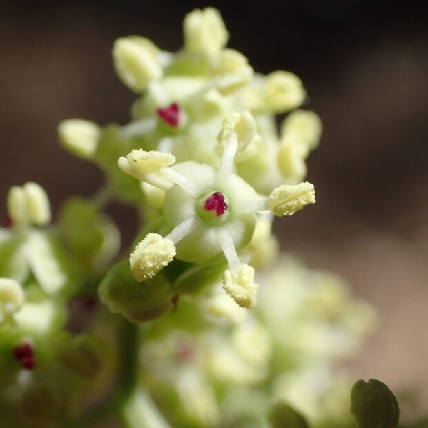 小さな花が沢山あつまって咲き、 クリーム色の泡のように見えます。 小さな花は、 近くで見ると真ん中の真っ赤な雌しべが目立ちます。