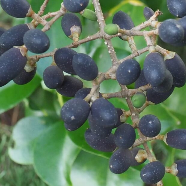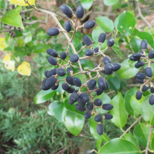 楕円形の実を沢山つけます。 10~12月頃、 黒紫色に熟します。 熟した実は日干しして漢方薬に使われ、 コーヒーの代用にもなります。