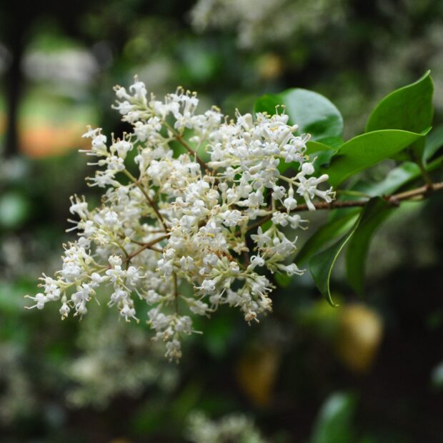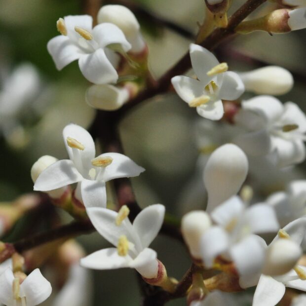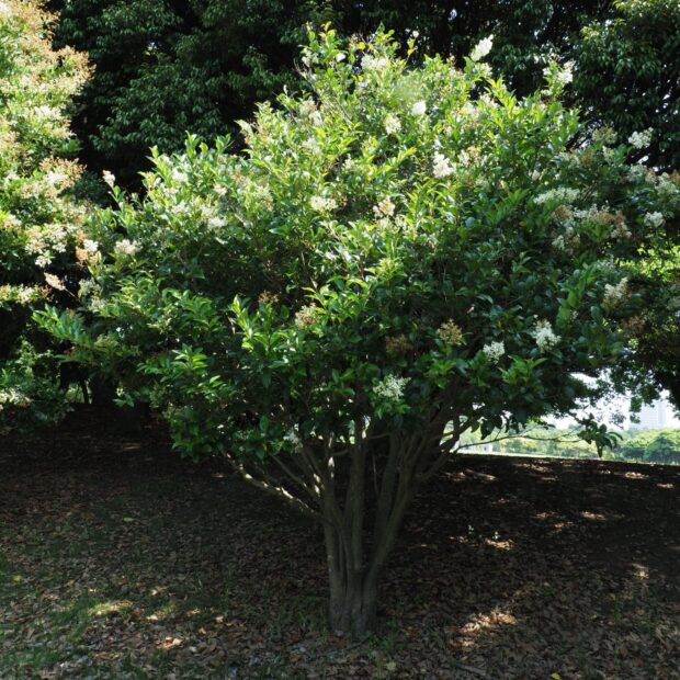 初夏に枝先に香りのよい白い小さな花を一度に沢山咲かせます。 似た花を咲かせるトウネズミモチよりも花は1か月ほど早いです。