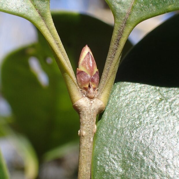 赤茶色の芽鱗(がりん・魚の鱗のような形をしており、 何枚も重ねて芽を守っている)に包まれています。