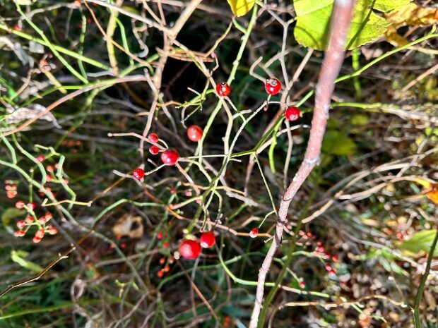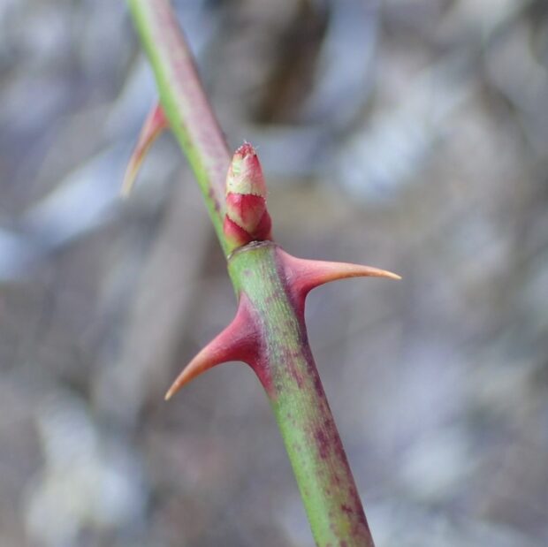 若い枝は緑色ですが、 時間が経った枝は黒紫色の樹皮をしています。 下向きのトゲを出して、 他の植物に絡みつきます。