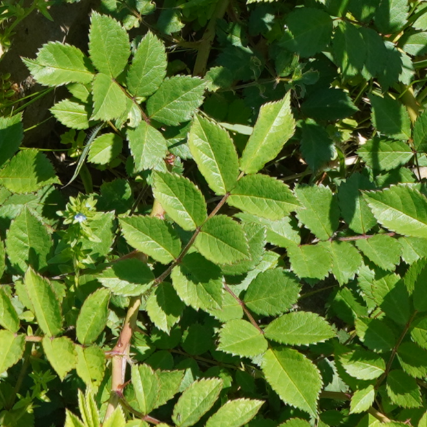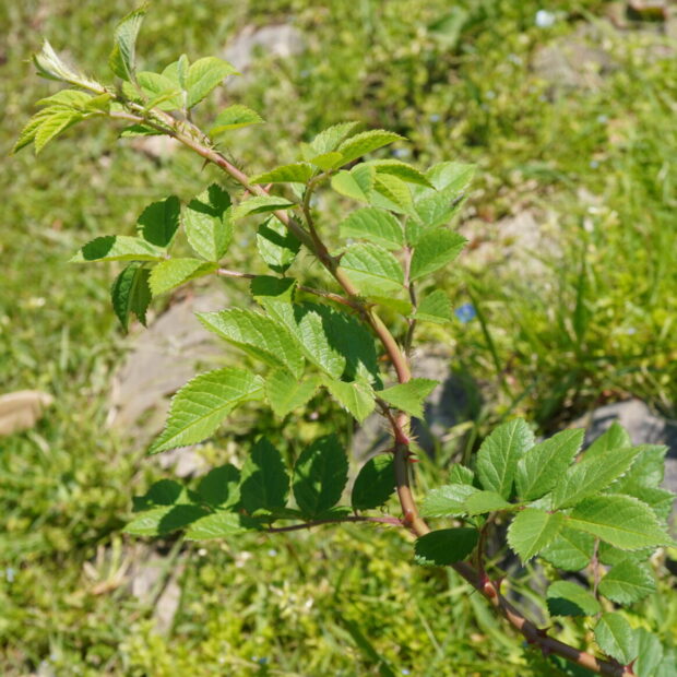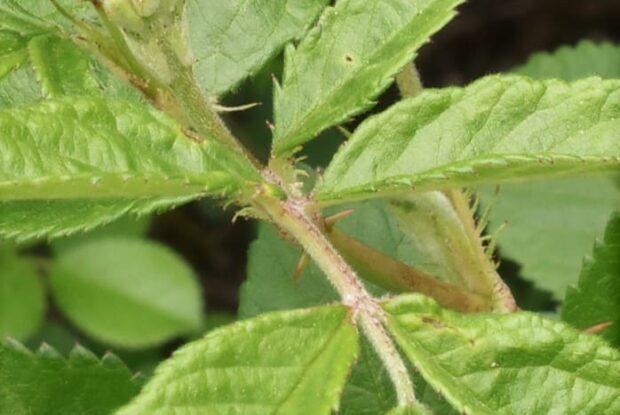 7~9枚の小さな葉っぱが鳥の羽のように付きます。 葉裏と軸に毛があり、 柄の付け根にある托葉(たくよう)という葉が細かくさけている点が、 他のバラの種類との見分けるポイントになります。
