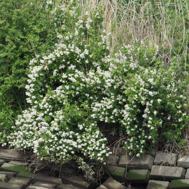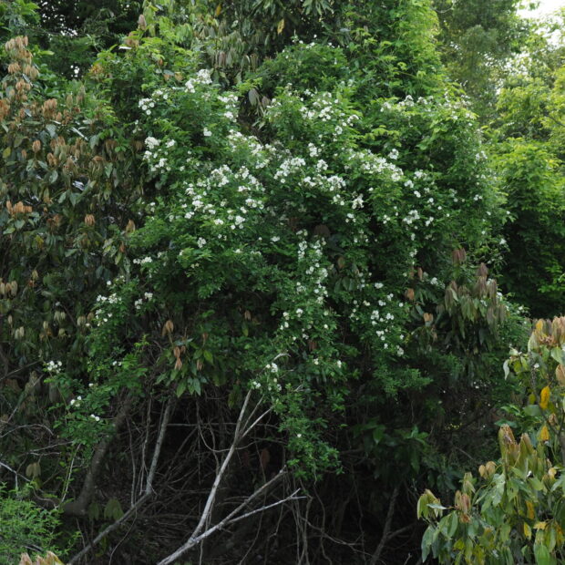 初夏、 枝先に直径2㎝くらいの良い香りのする白い花をたくさん咲かせます。 香りは香水にも使われます。