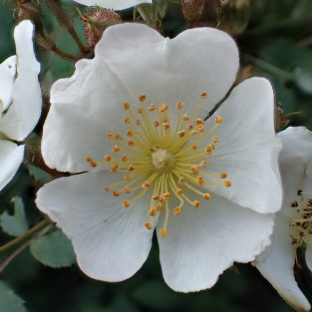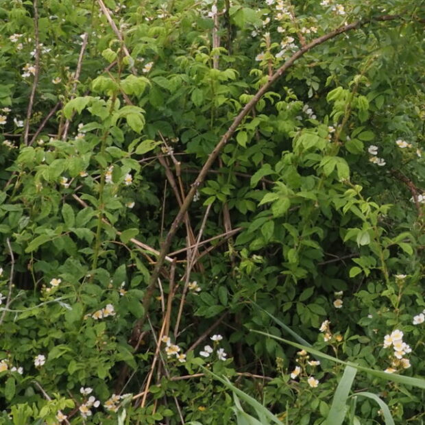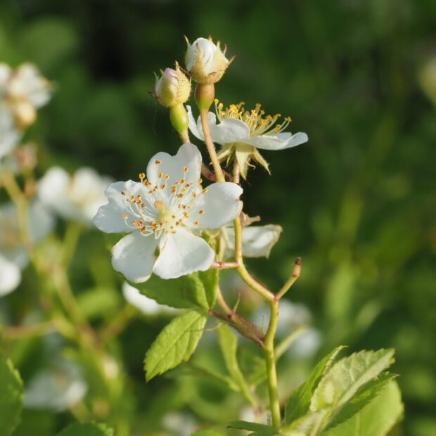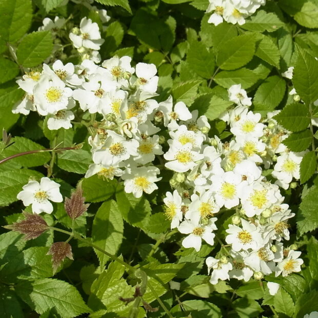 小さな白い花をたくさん咲かせ、 かわいい紅い実を付ける野生のバラです。