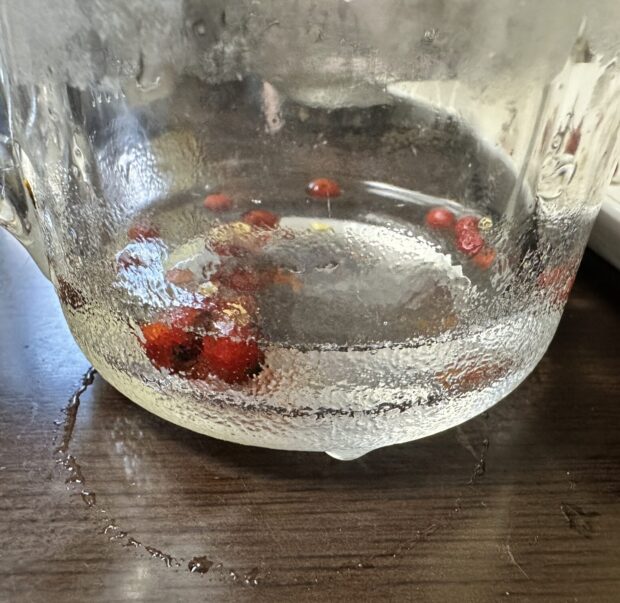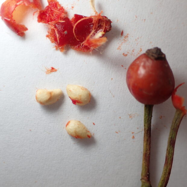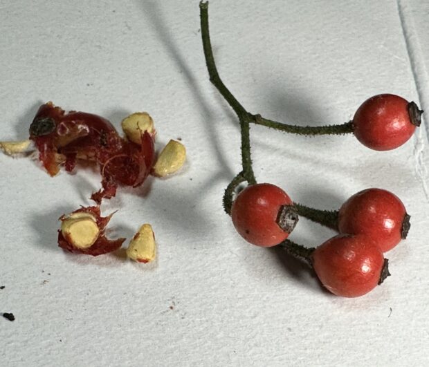赤い実をむくと出てくる、 いくつかの白い実の薄い皮の中には種が入っていますが、 この薄い皮は、 ほんのり甘酸っぱい味がします。 中にはあまり味が無い実もありますが、 この実を数粒つぶして、 お湯をかけて飲むと、 ほんの~り甘酸っぱい、 薄いローズヒップティーになります。 (ただし下剤の効果があるので飲みすぎにはご注意ください)