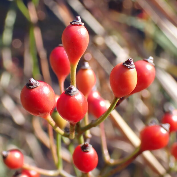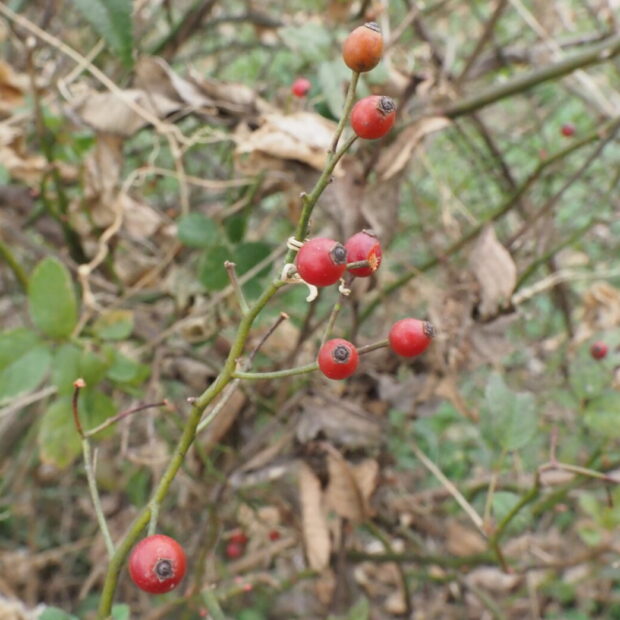 小さな赤い実(正確には「偽果(ぎか)」という)は、 秋から冬にかけて赤く熟します。