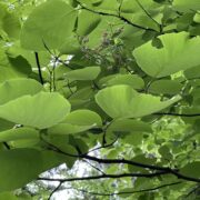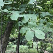 大人の手のひらほどもある大きな円い葉です。 先がツンと少しとがります。 葉の裏には毛が沢山生えていていて白っぽく見えます。