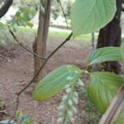 青みがかった灰色の実が実ります。 中にはラグビーボール型のこげ茶色の種が1個入っています。 江戸時代にはこの種からハクウンボク油をとり、 蝋燭の材料などにされました。