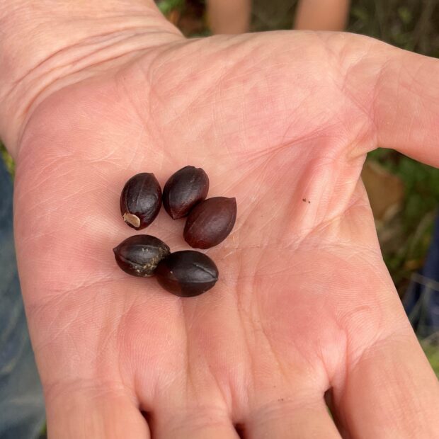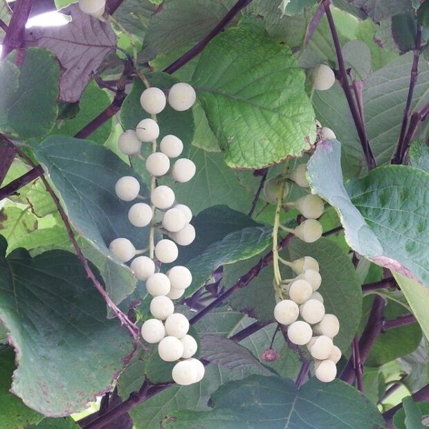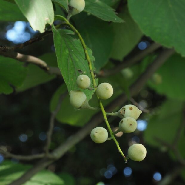 青みがかった灰色の実が実ります。 中にはラグビーボール型のこげ茶色の種が1個入っています。 江戸時代にはこの種からハクウンボク油をとり、 蝋燭の材料などにされました。